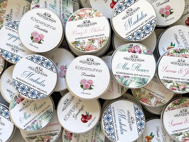 Körpersahne mit Arganöl Die Delicious Soaps Körpersahne wird in eigener Manufaktur mit wertvoller Sheabutter, pflegendem Mandelöl, kostbarem Arganöl und natürlichem Vitamin E hergestellt. So entsteht eine intensiv pflegende, sahnige Creme für den täglichen Schutz Ihrer Haut. Sie eignet sich hervorragend als reichhaltige Pflege für den ganzen Körper und kann ebenfalls bei trockenen, schuppigen Hautpartien hilfreich sein. Schmilzt zart auf der Haut, zieht rasch ein, klebt nicht und macht eine herrlich glatte, zarte Haut. Luxuriöse, pflegende und feuchtigkeits spendende Inhaltsstoffe geben Ihrer Haut optimale Pflege und Feuchtigkeit für ein zartes, gepflegtes Hautgefühl.