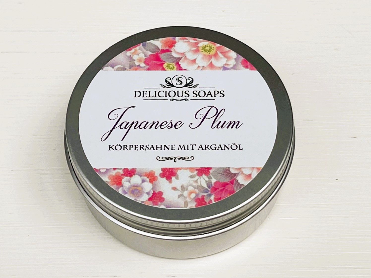 Die Körpersahne Japanese Plum wird in eigener Manufaktur mit wertvoller Sheabutter, pflegendem Mandelöl, kostbarem Bio-Arganöl und natürlichem Vitamin E hergestellt.