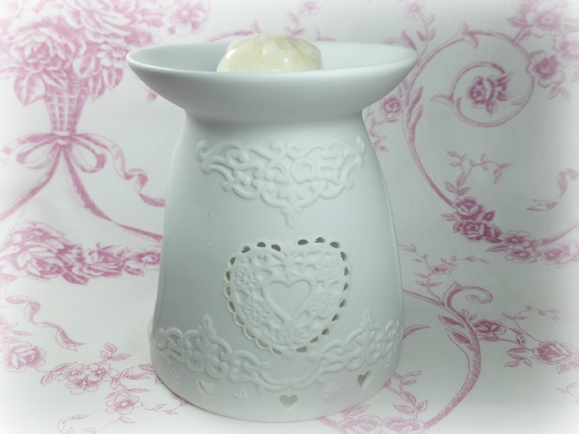 Wunderschöne Duftlampe aus feinstem, weißem Bisquitporzellan, in welches ein zartes, reliefartiges Design eingearbeitet ist.