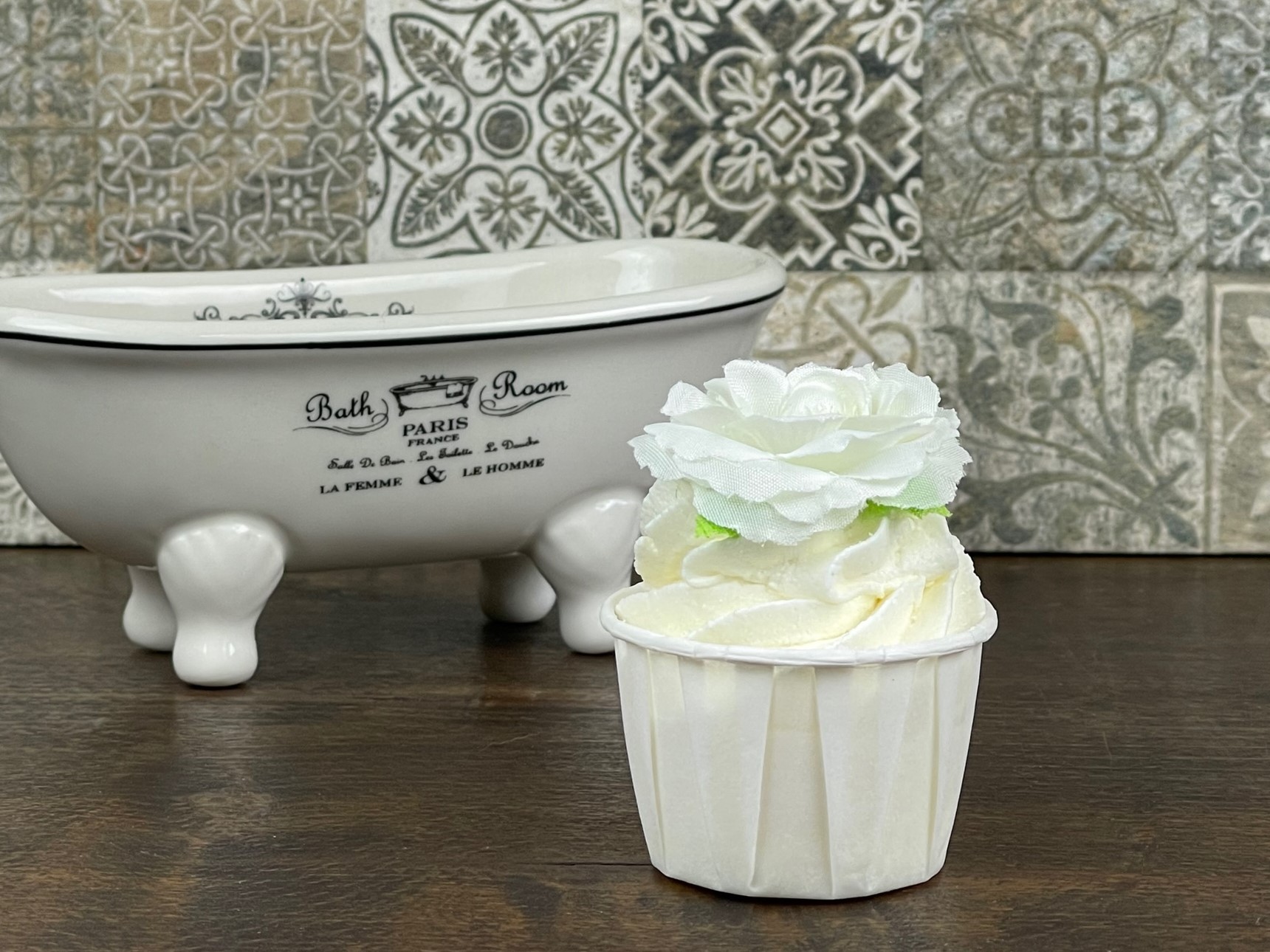 Anwendung: Ein Badecupcake in das einlaufende Badewasser geben. Die kostbaren Inhaltsstoffe machen das Törtchen zu einem Creamer. Das Eincremen nach dem Bad ist meist unnötig.