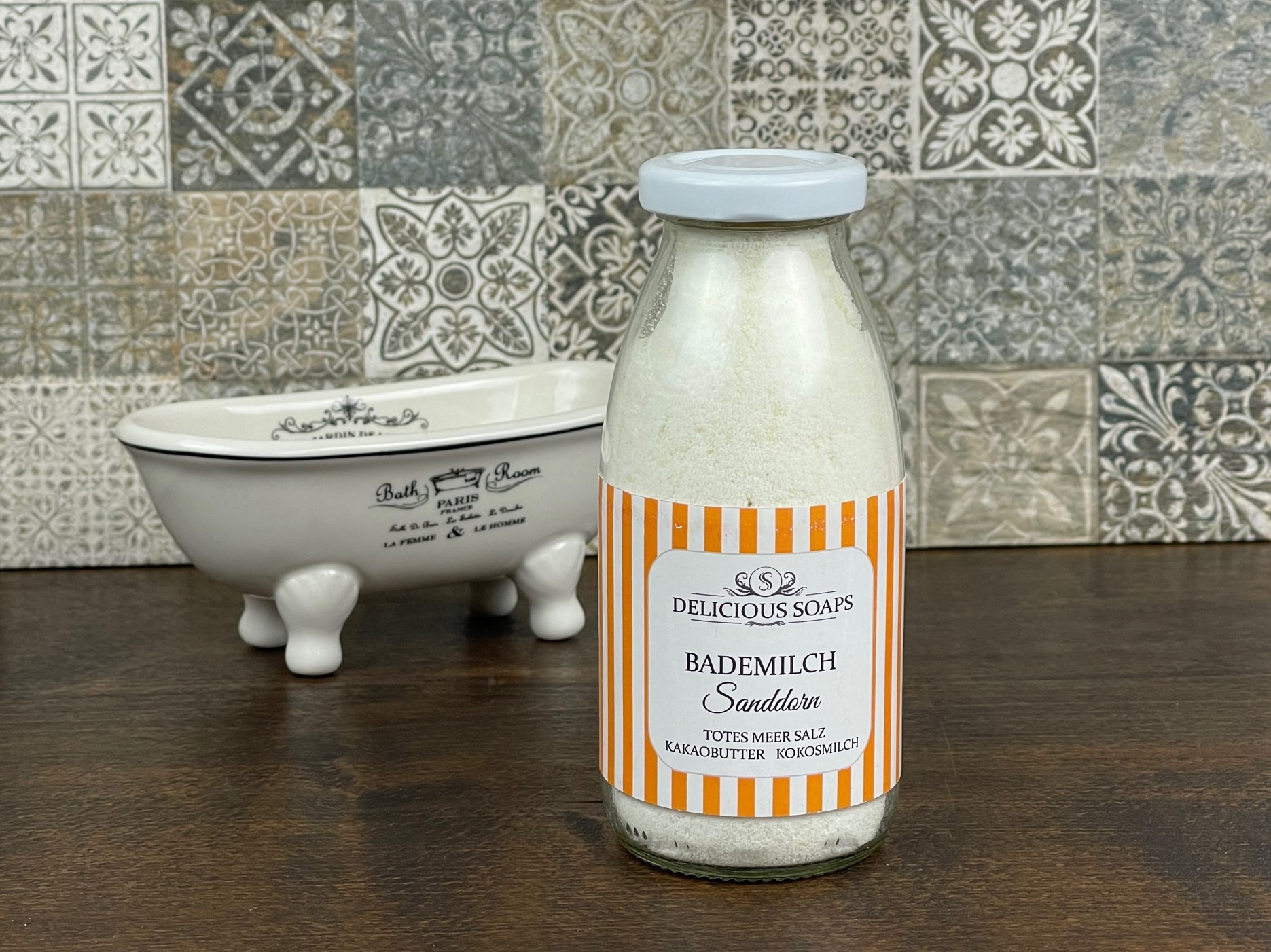 Die vegane Bademilch Sanddorn verwandelt das Bad in einen fruchtigen Badespaß mit intensiver Pflege.