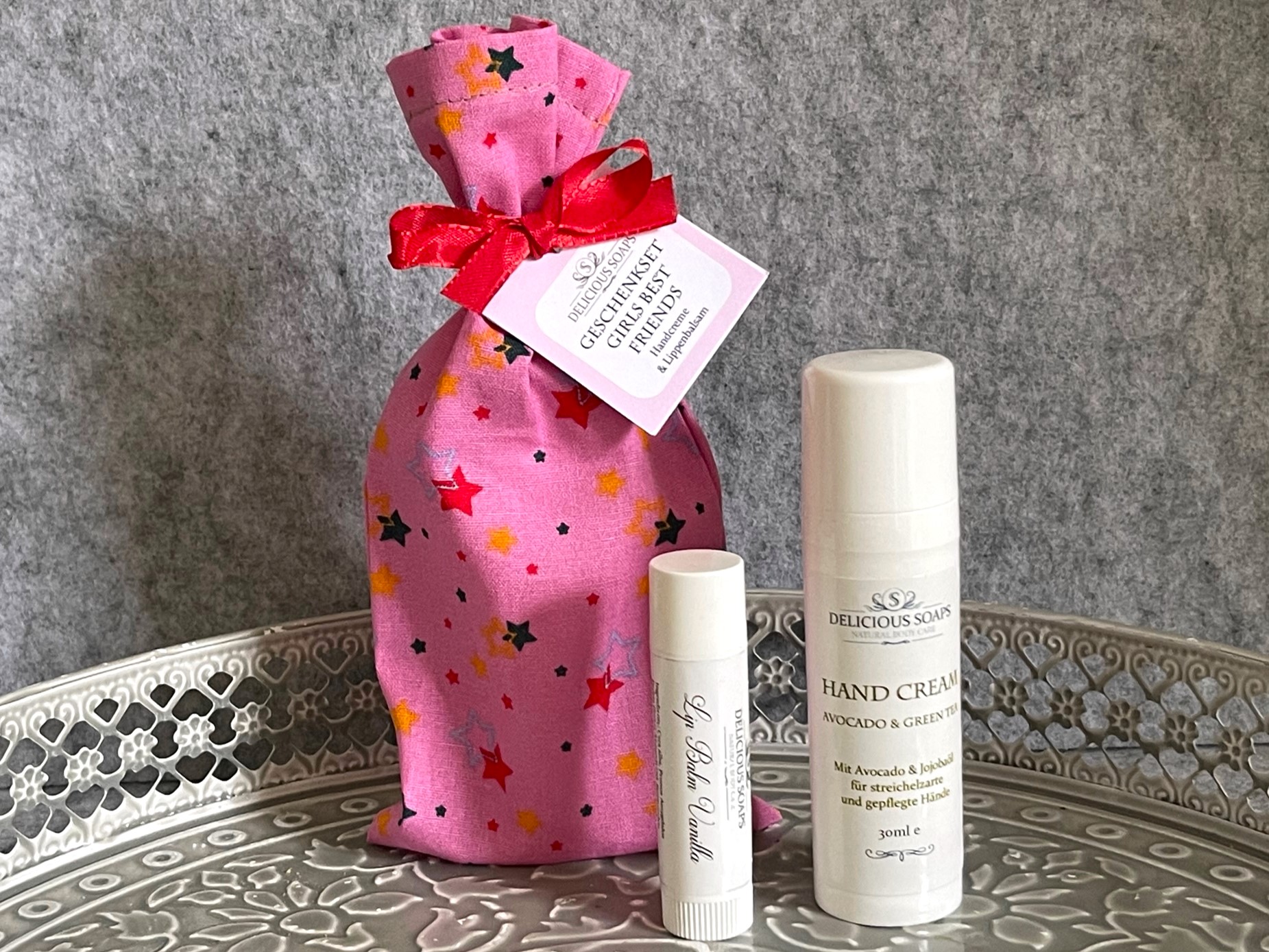Unsere Hände und Lippen benötigen eine besonders intensive und feuchtigkeitsspendende Pflege. Das Geschenkset Girls best Friends pflegt die Haut mit wertvollen Pflanzenölen nachhaltig und versorgt sie mit viel Feuchtigkeit.