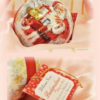 Die Füllkugeln mit nostalgischem Weihnachtsmotiv werden in Handarbeit im Erzgebirge hergestellt. Da wir die Badepralinen separat in Tütchen verpacken, können die Kugeln als Dekoration oder Baumschmuck weiter verwendet werden.