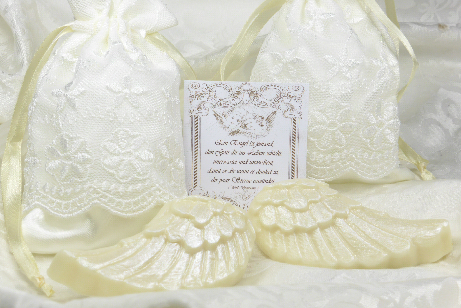 Die Delicious Soaps Gästeseife Engelsflügel ist in ein romantisches Satinbeutelchen mit viel Spitze verpackt. Jedem Seifenflügelchen liegt ein Spruchkärtchen bei.