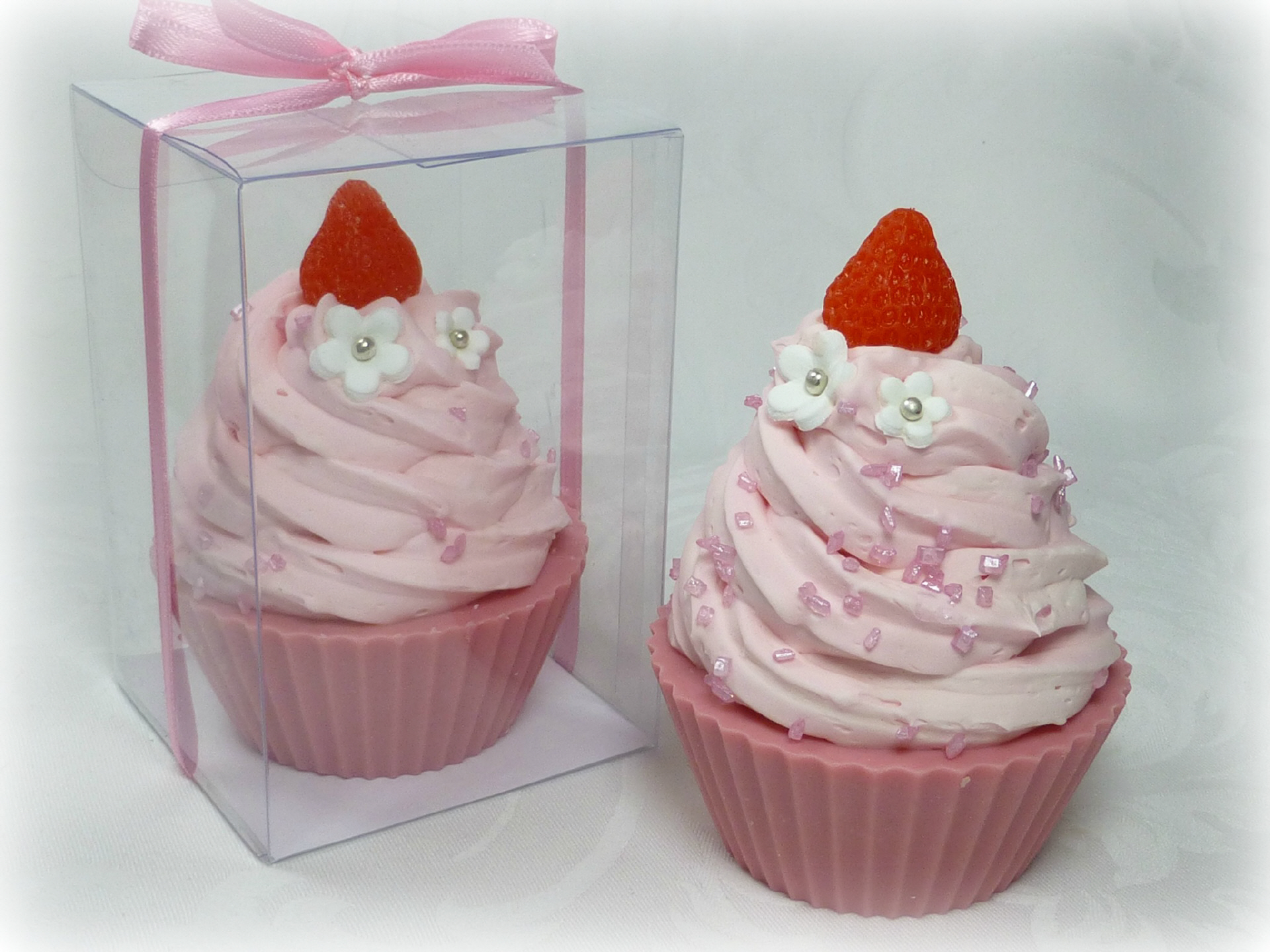 Unsere Cupcake Soaps werden von Hand mit filigranen Sugarpaste Blüten und einer Deko Erdbeere dekoriert und in einer ansprechenden Klarsichtverpackung mit Schleife versendet.