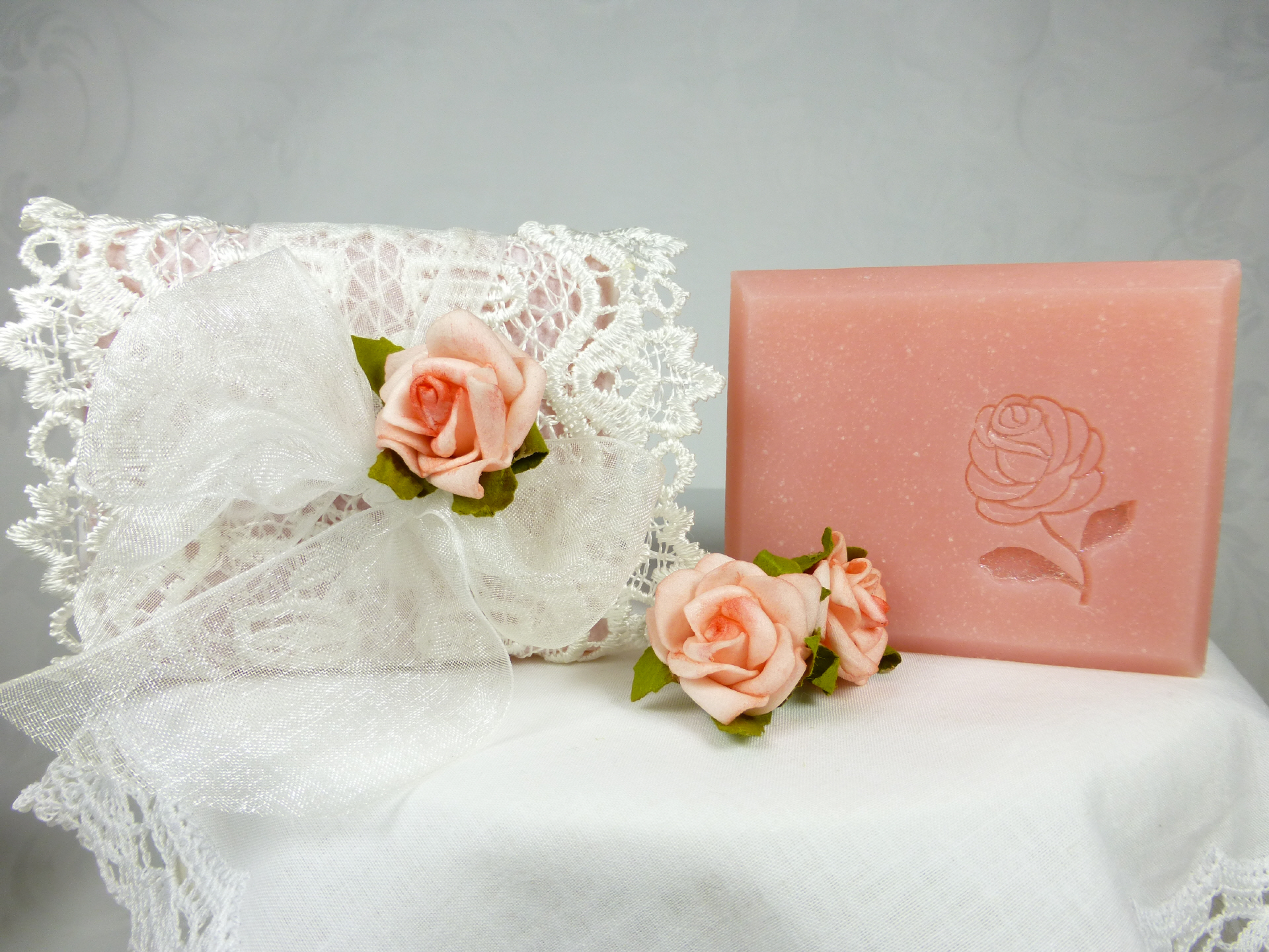 Die edle Rosenseife im Vintage Stil wurde von uns liebevoll in kostbare Spitze verpackt.